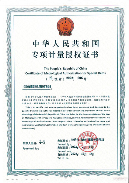 • 專項計量授權證書